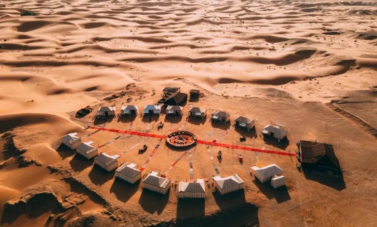 La région autour des dunes d’Erg Chebbi à Merzouga attire de nombreux visiteurs pour des balades à dos de chameau, nuits sous tente et couchers de soleil spectaculaires dans le désert.